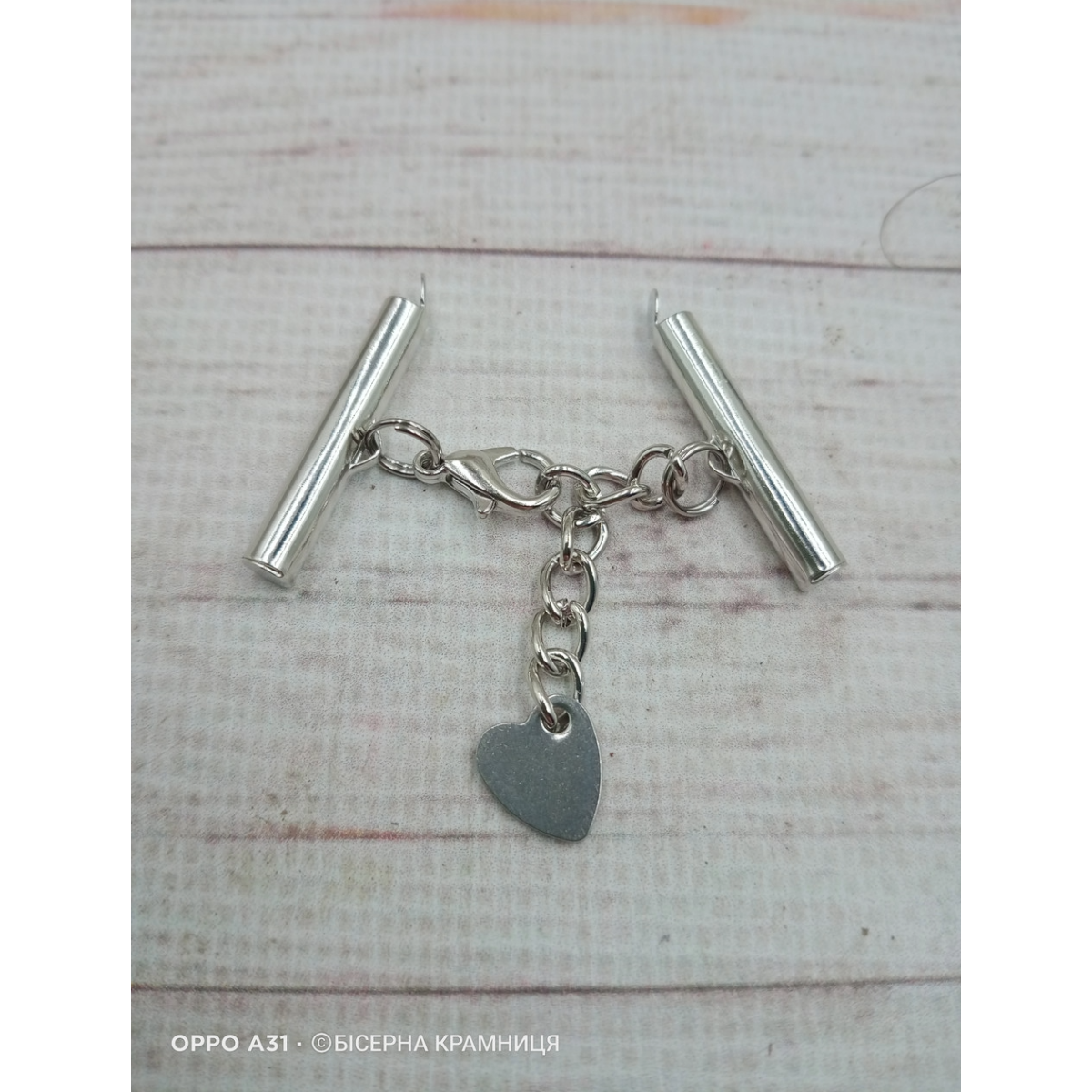 Довжина трубочок-слайдерів 25 мм, розмір ланки ланцюжка 5,5*4*0,8 мм, подвійні кільця 6 мм в діаметрі, карабін 6*12 мм, двосторонній шарм-сердечко 10*10 мм. Ціна за 1 комплект.