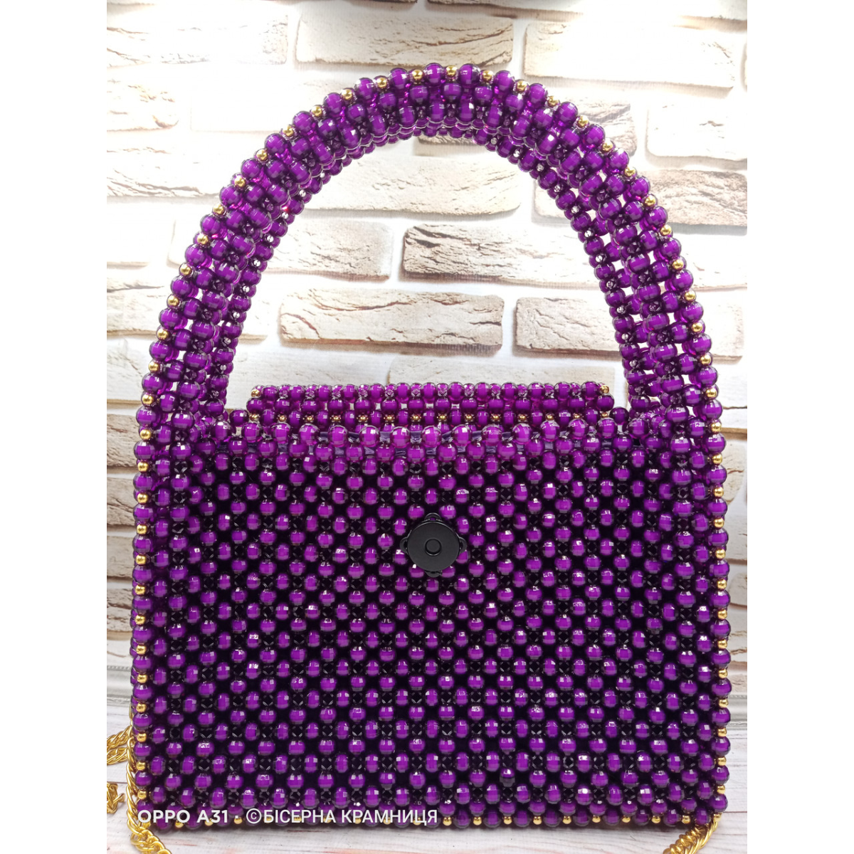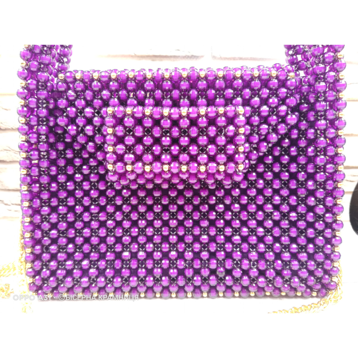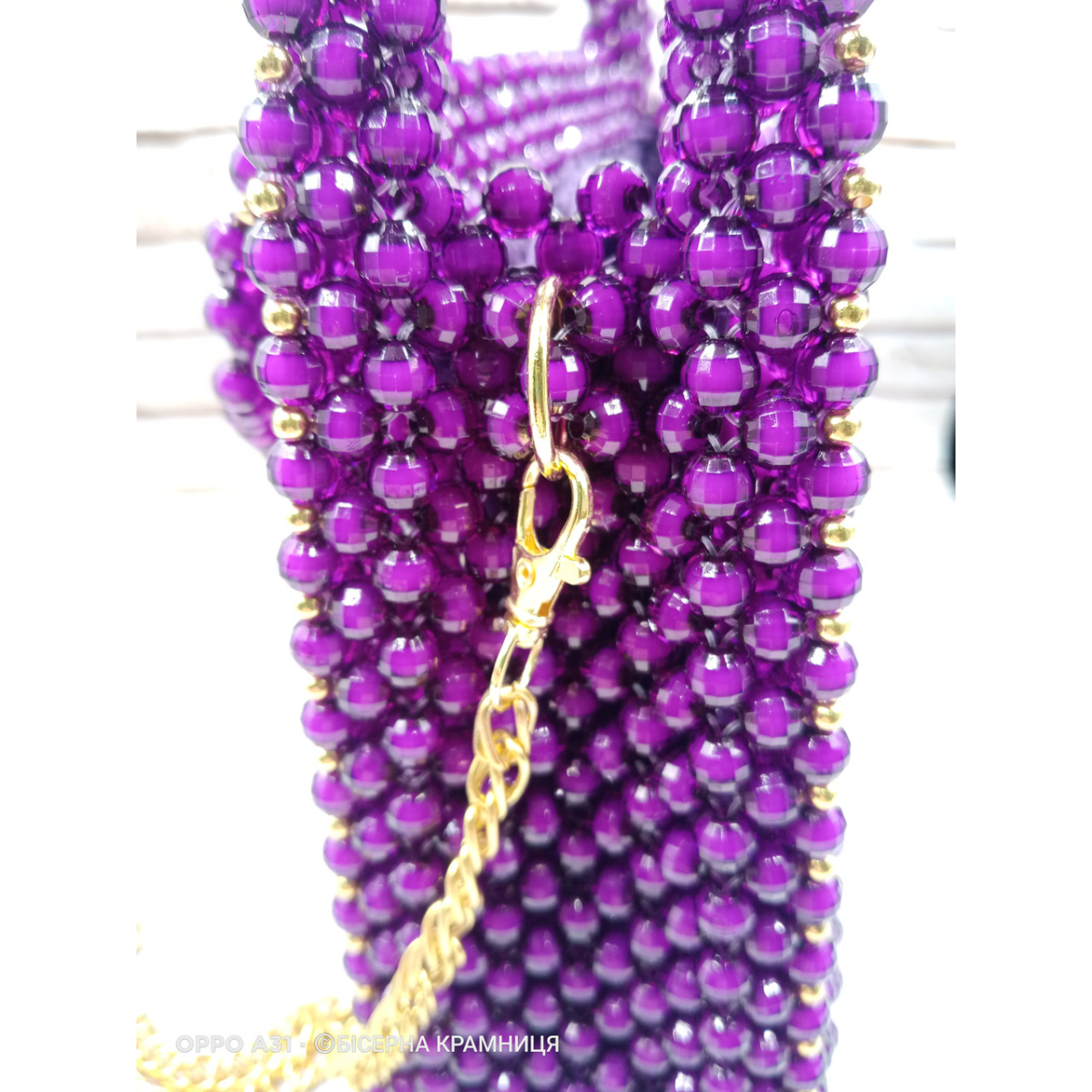 Сумочка з акрилових намистин, підкладка з карманом, магнітний замочок матового чорного кольору, фурнітура під жовте золото, з“ємний ланцюжок 120 см.