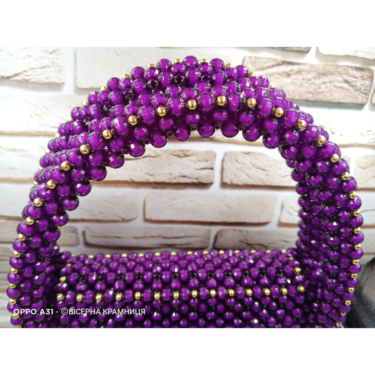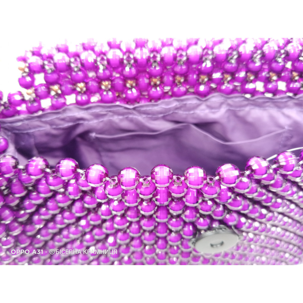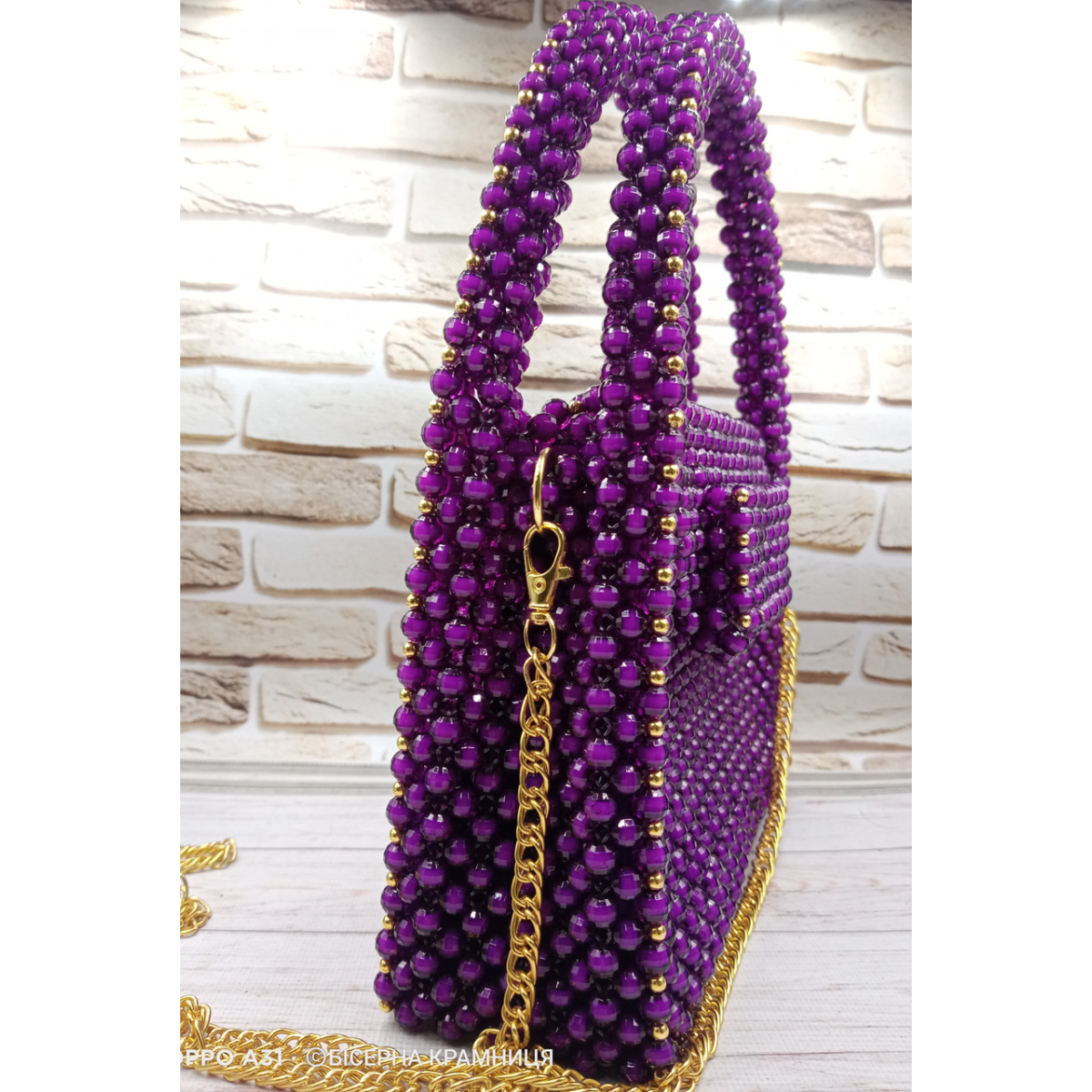Сумочка з акрилових намистин, підкладка з карманом, магнітний замочок матового чорного кольору, фурнітура під жовте золото, з“ємний ланцюжок 120 см.