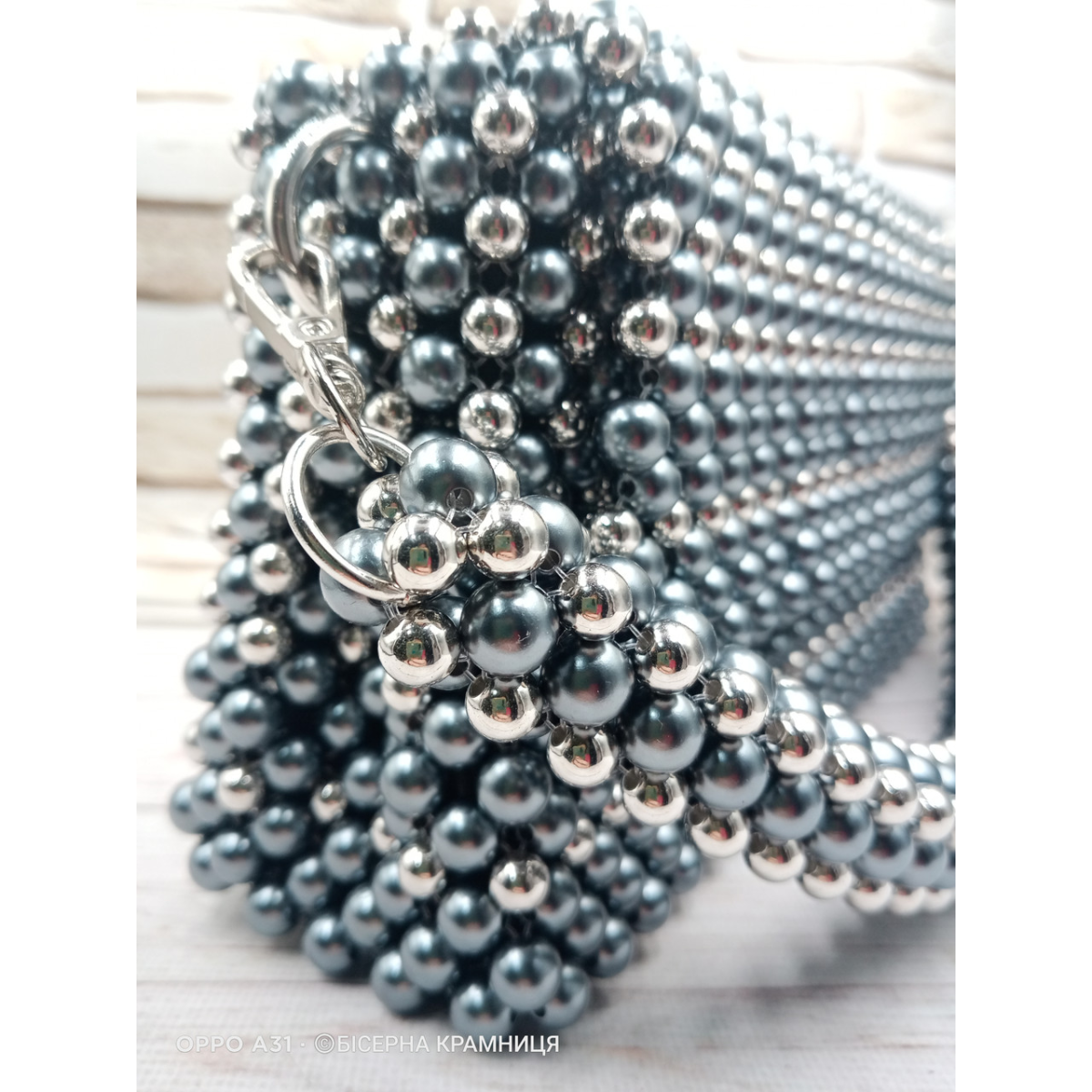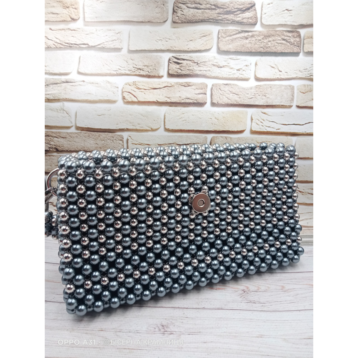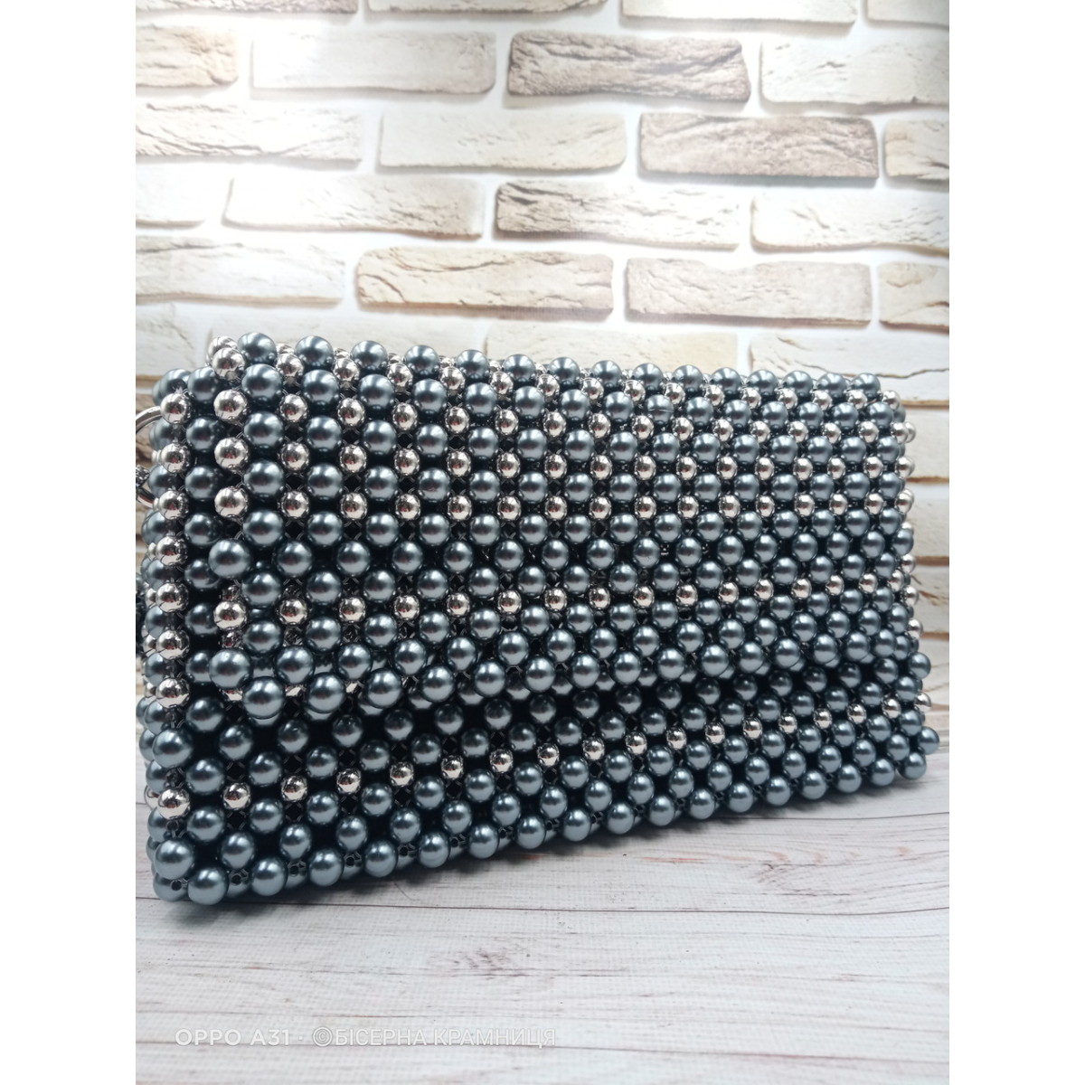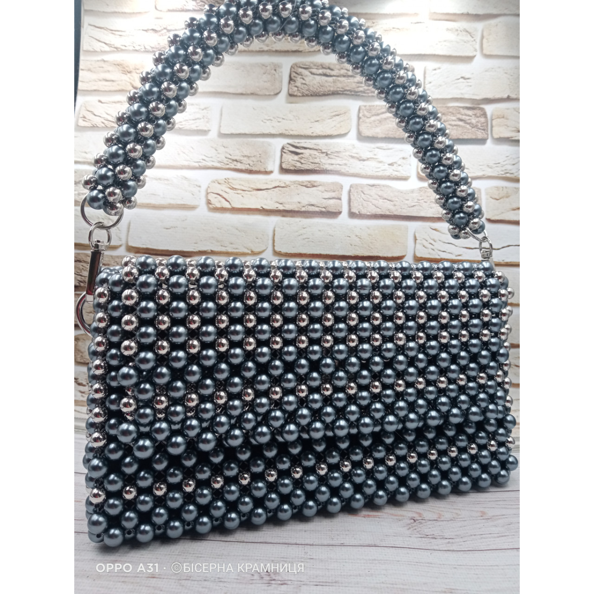 Ексклюзивна сумочка із намистин кольору гематиту та кольору срібла. Не дуже гламурна, але вишукана та стильна. Чудово підійде як для повсякденного носіння, так і для вечірнього вбрання. Підкладка з двома кишеньками та з відділенням на блискавці. В сумочку входить мобільний телефон, гаманець, дрібниці.