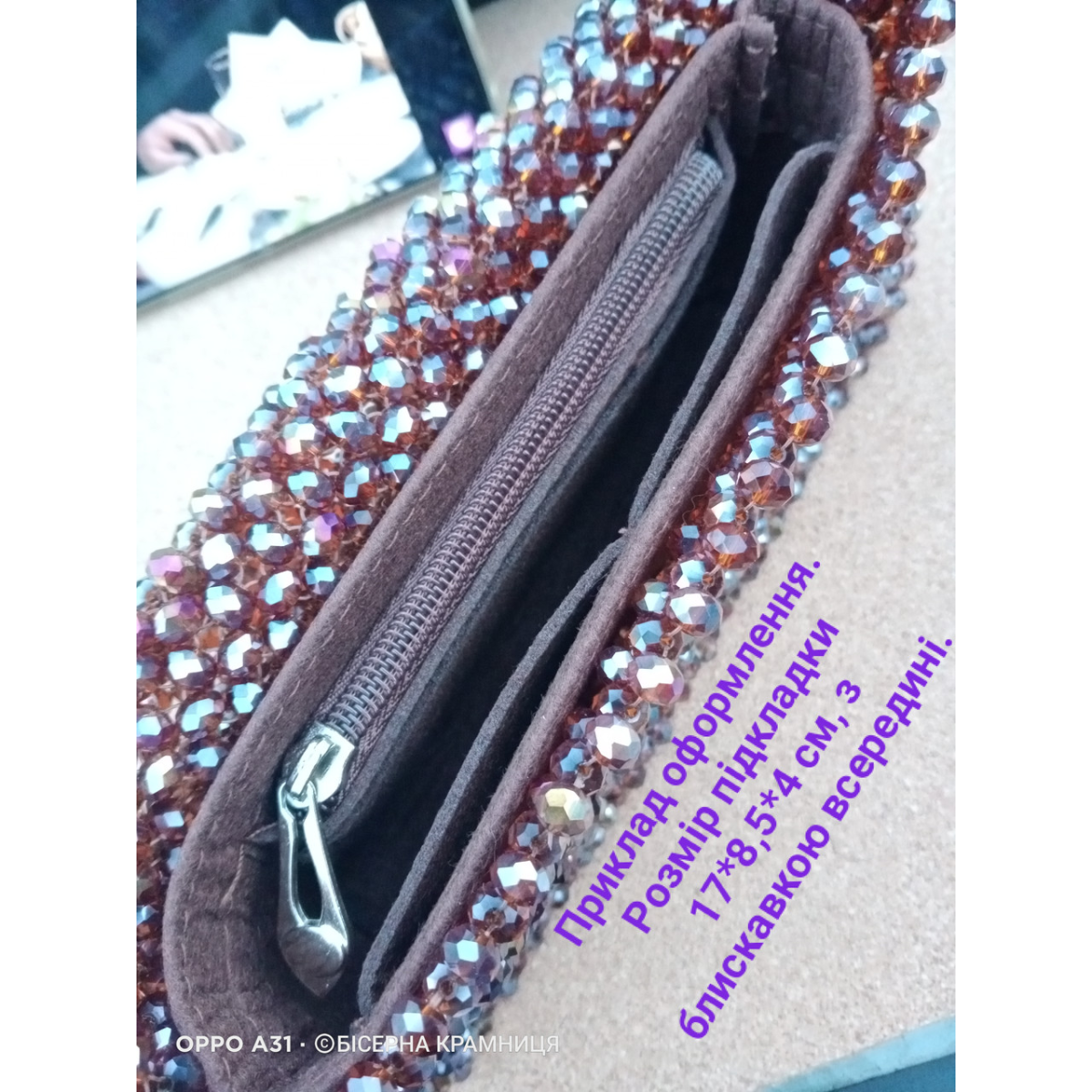 Темно-сіра підкладка з фетра для сумочок з намистин, з блискавкою. Розмір 17*8,5*3 см