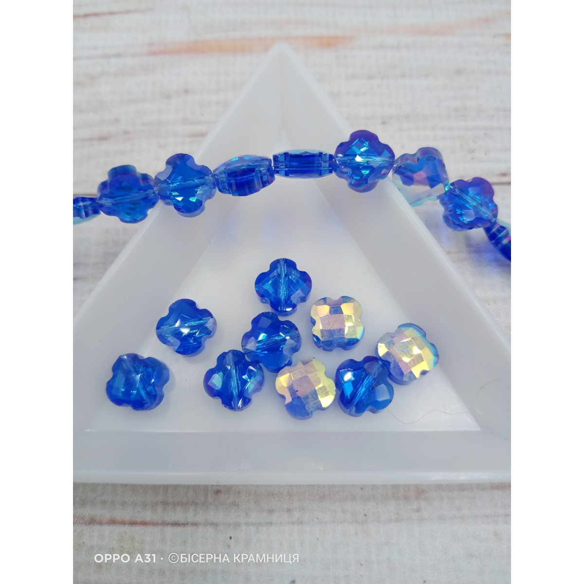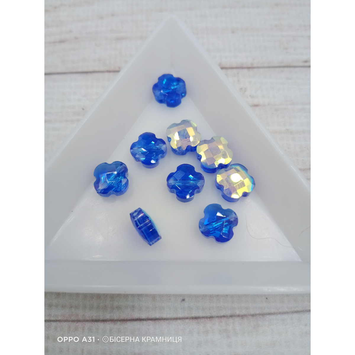 Намистини в формі конюшини, 8*8*3,5 мм. Світло-сині прозорі. Ціна за штуку